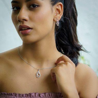 Parties are occasions which can be sometimes interesting, sometimes boring. But what will never make you boring or indifferent is the double pear necklace studded with diamonds along the outer lining of the pendant. This design includes two hollow pears made out of silver, piercing each other and giving the pendant a unique, subtle look. Along the curved outline of the outer pear, the American diamonds are gently and carefully studded. This gives the pendant an elegant look and the diamonds reflect brilliantly when light falls on them, giving them a natural luster.