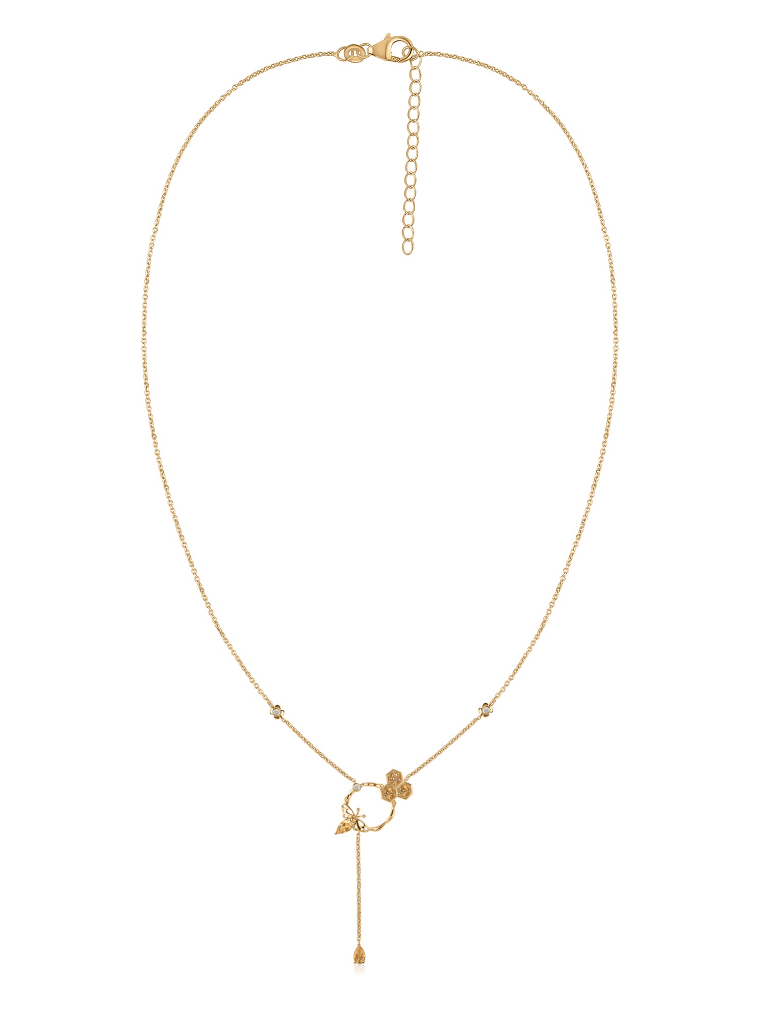Inspired by nature’s sweetest artistry, this gold-plated silver necklace features a charming honeybee motif resting on a delicate honeycomb ring. Accented with sparkling stones and a graceful drop detail, it brings playful elegance and modern femininity to your everyday style.