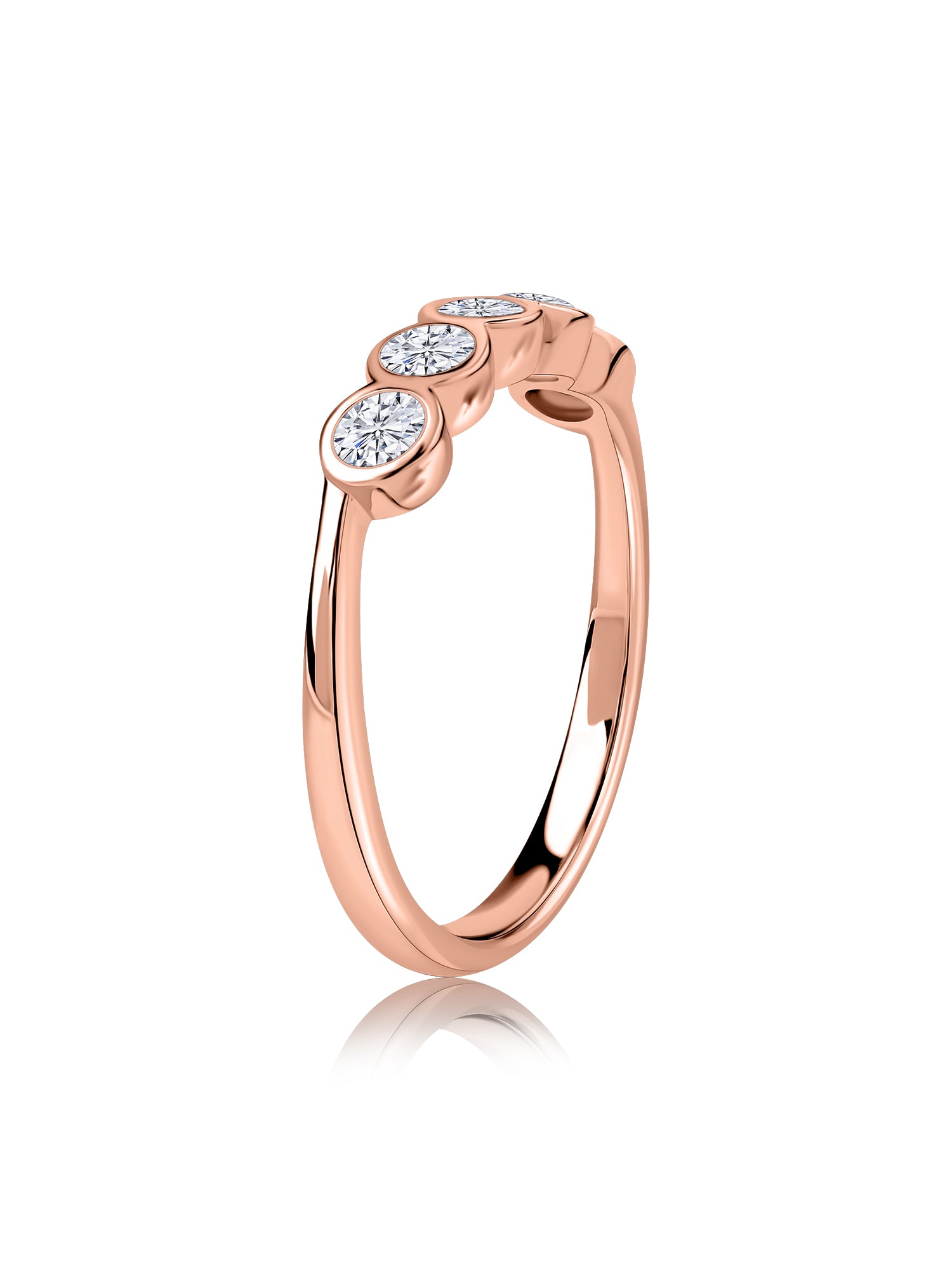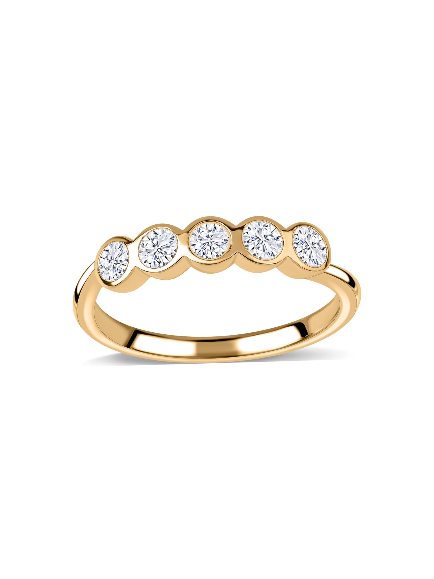 A sleek twist on a classic design, this diamond band showcases 5 round lab-grown diamonds, each 3.00 MM in size, securely nestled in elegant bezel settings. the ring offers a refined and contemporary aesthetic with a total diamond weight of 0.540 carats. Perfect for stacking, daily wear, or as a statement of modern elegance, this ethically crafted piece blends sophistication with everyday comfort.