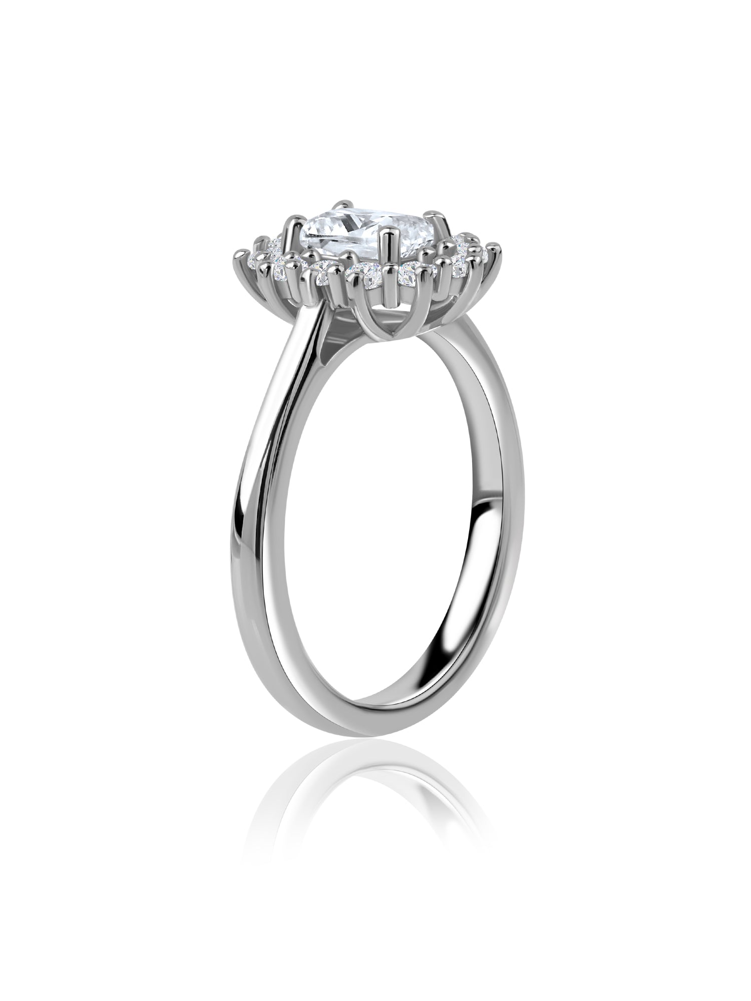 A vintage-inspired cushion-cut sparkle surrounded by a radiant halo—Evara is your timeless classic with modern elegance.