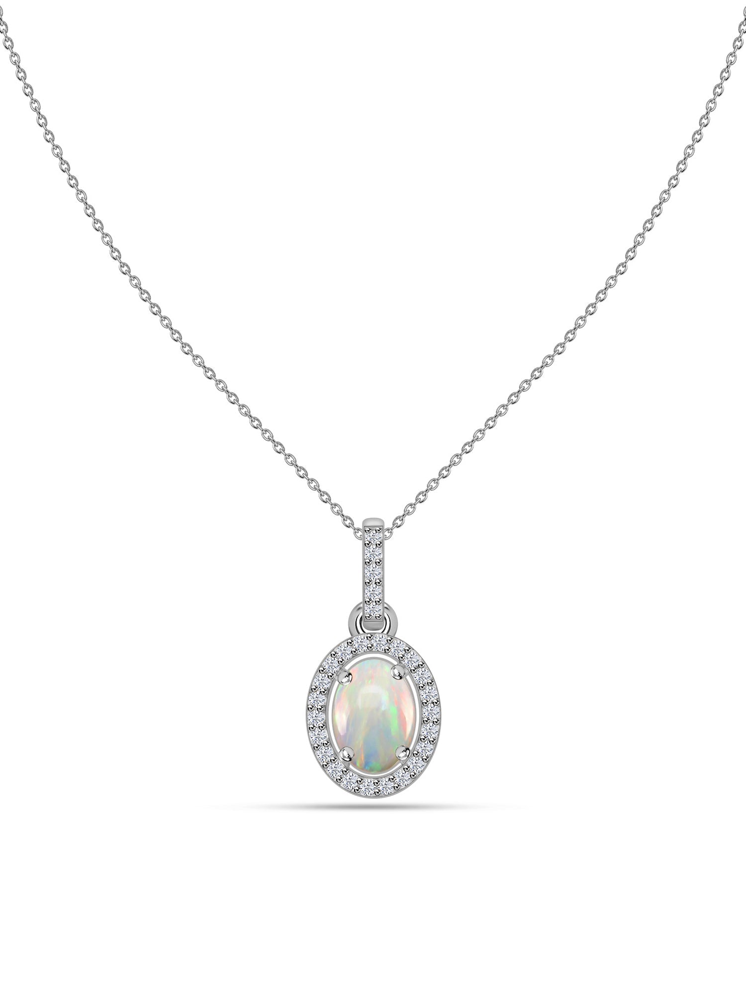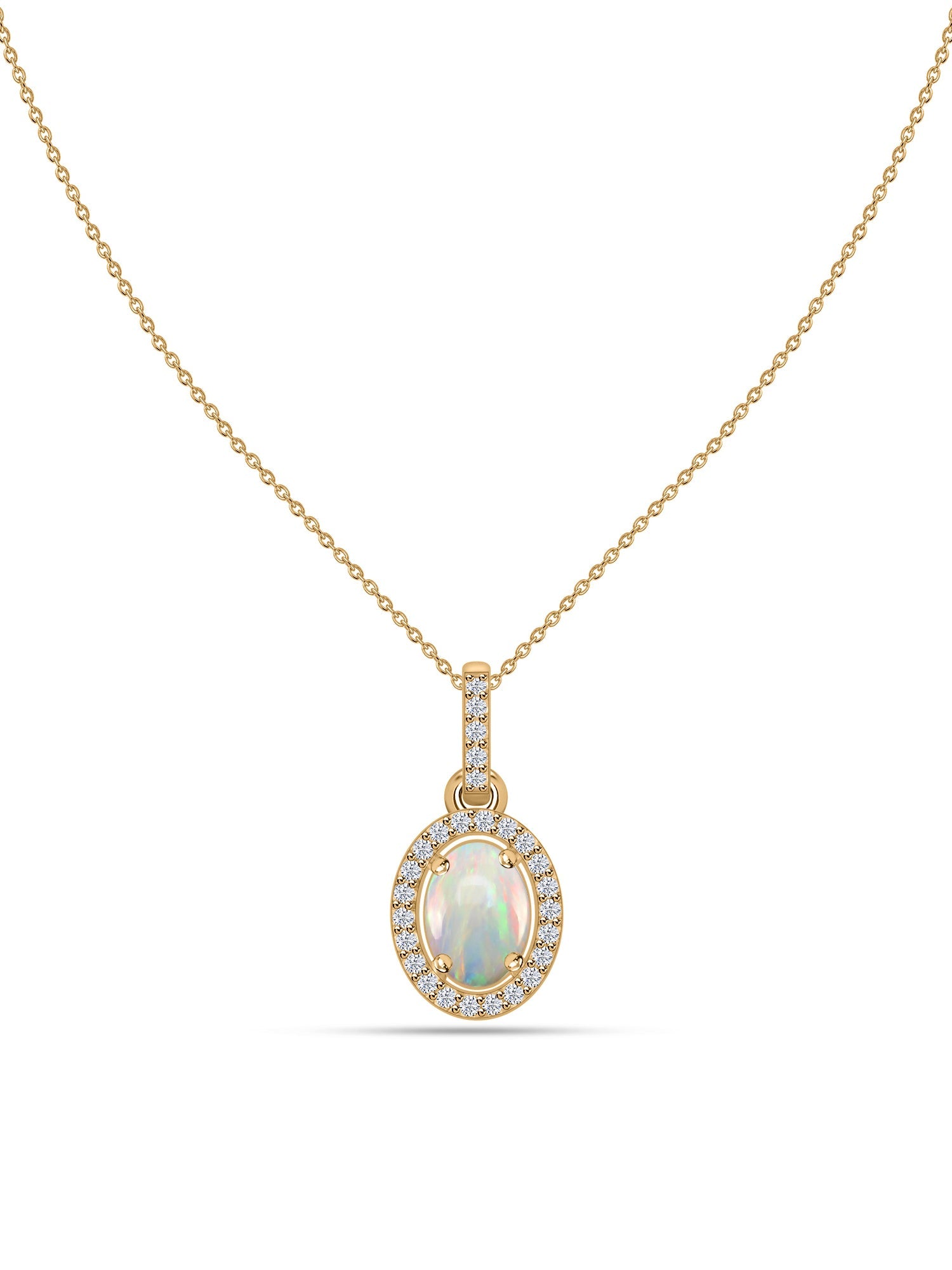 With a soft celestial glow, this natural Ethiopian opal is surrounded by a luminous halo of lab-grown diamonds. Suspended from a graceful gold chain, this pendant captures the essence of timeless elegance and inner radiance. Wear it to feel anchored in beauty, always.