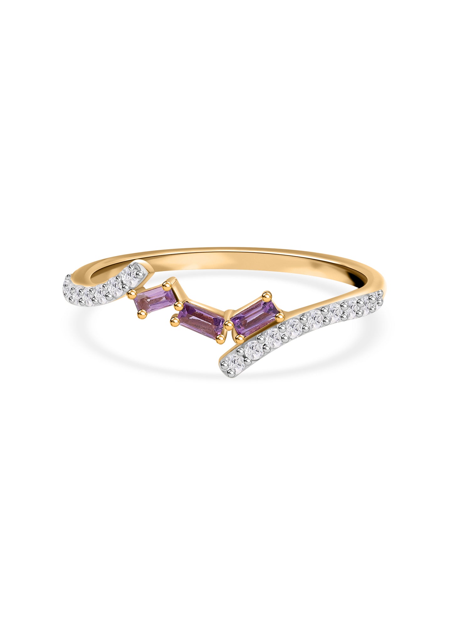 Three blushing natural purple amethyst gems adorn the center of this delicate band ring, and the sides have the sparkle of white zirconia.