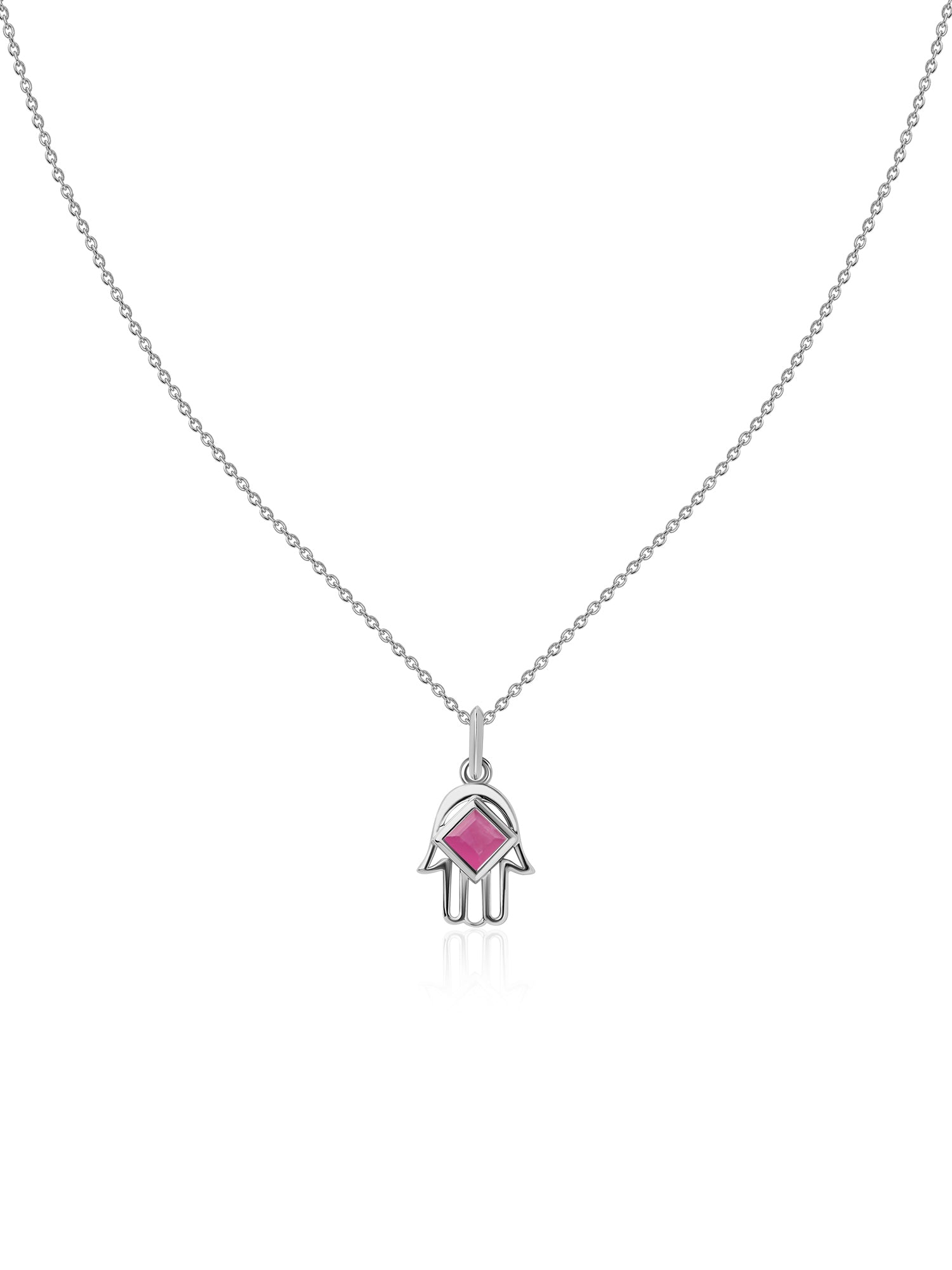 Crafted in sterling silver, this pendant showcases the protective Hamsa hand, accented with a natural red ruby. Thought to attract calm and positive energy, this talisman is both a beautiful amulet and a style-forward statement.
