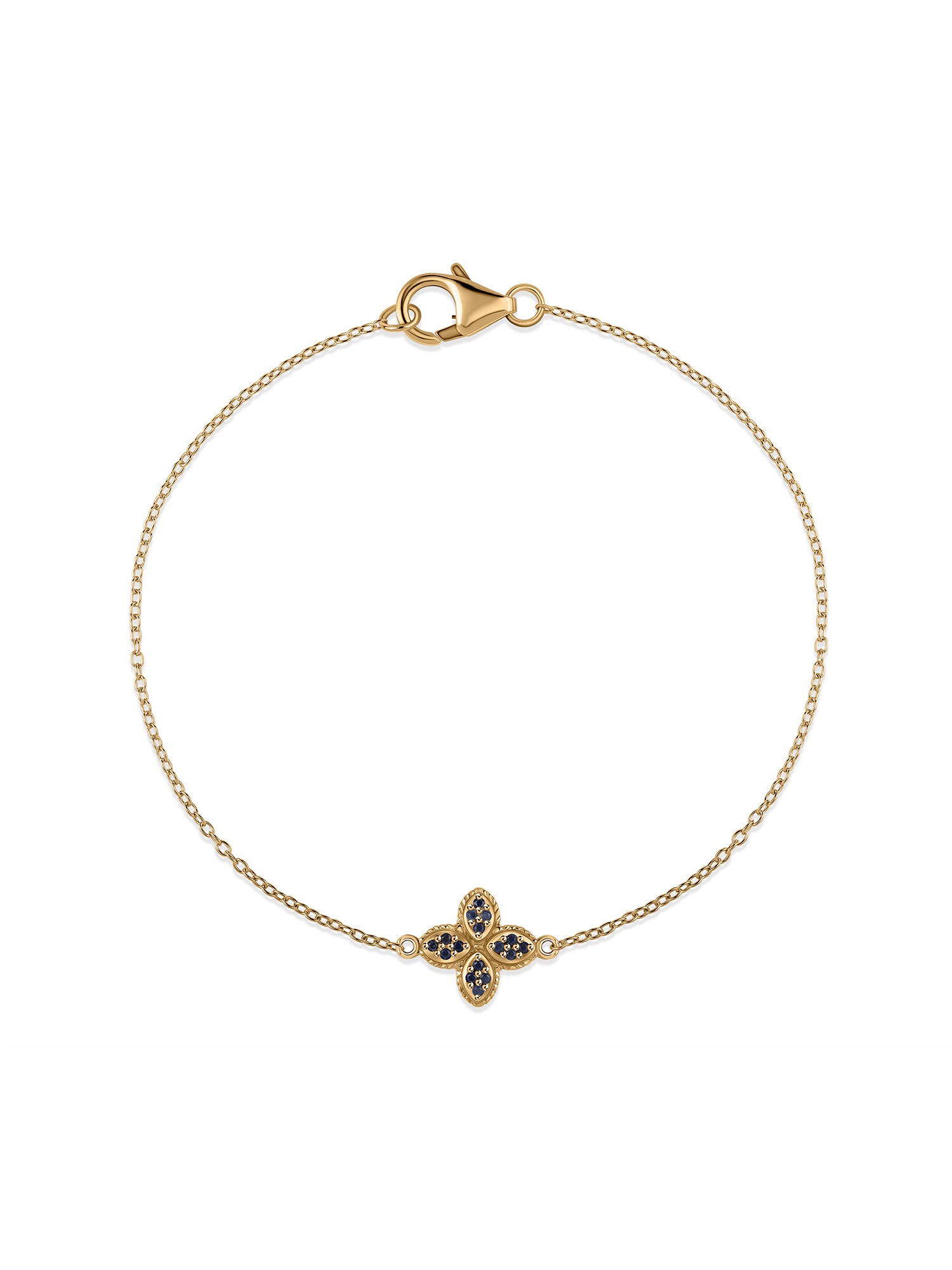 A floral bracelet with blue sapphire gems that shine and glow with the yellow plating, making it a perfect gift for women