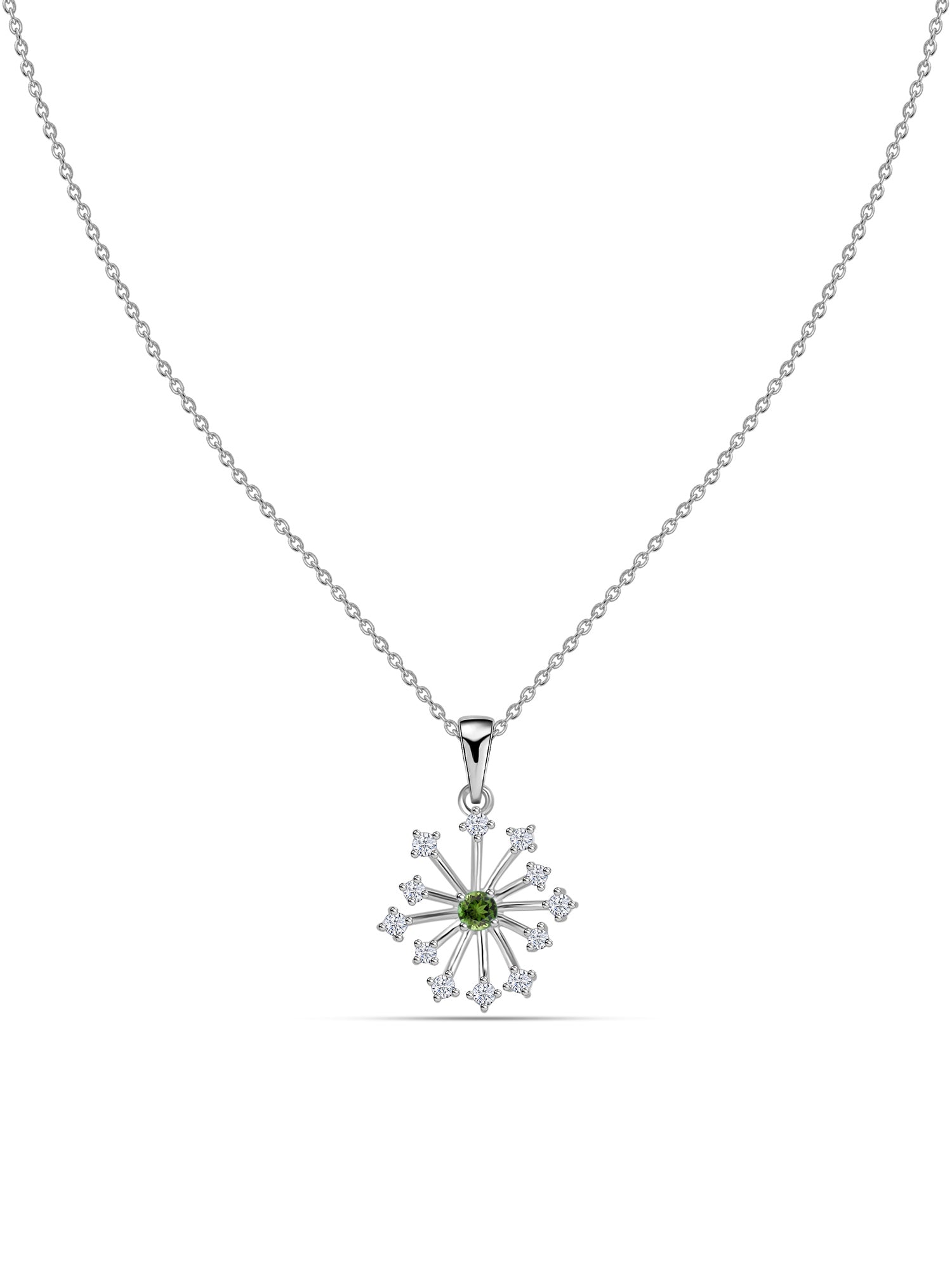 This graceful snowflake pendant captures winter elegance with a sparkling Natural Green Tourmaline at its center, surrounded by brilliant lab-grown diamonds. Crafted in lustrous gold, it radiates symmetry and charm — perfect for gifting or adding a seasonal sparkle to your jewellery box—a timeless, nature-inspired design with a modern twist.