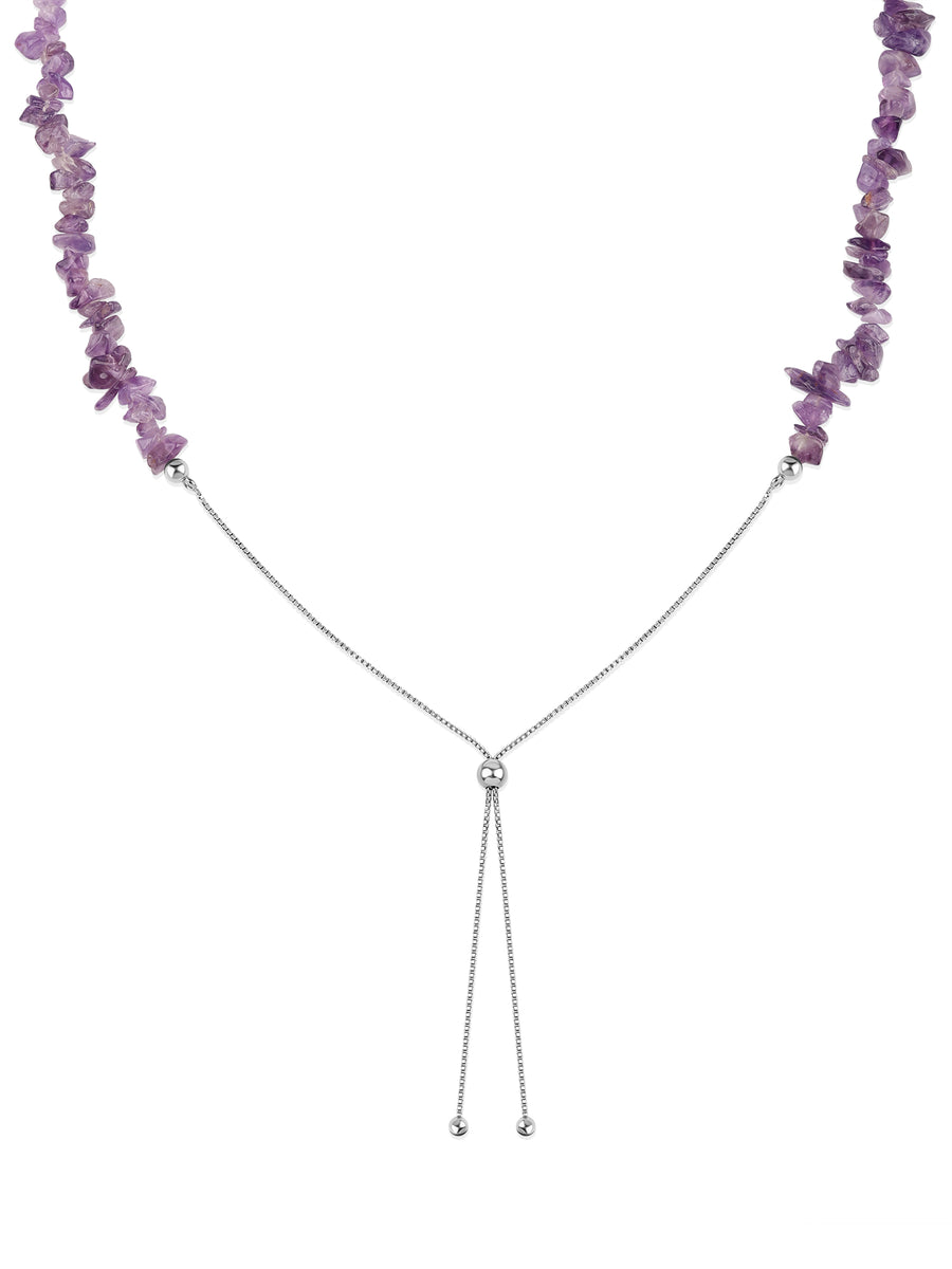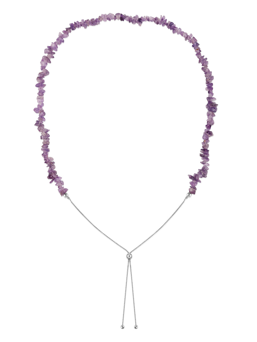 I made this Amethyst bolo-style necklace, featuring genuine amethyst stone chips and a designer twist of a bolo chain. It's a chic piece, and you can wear it at any length.