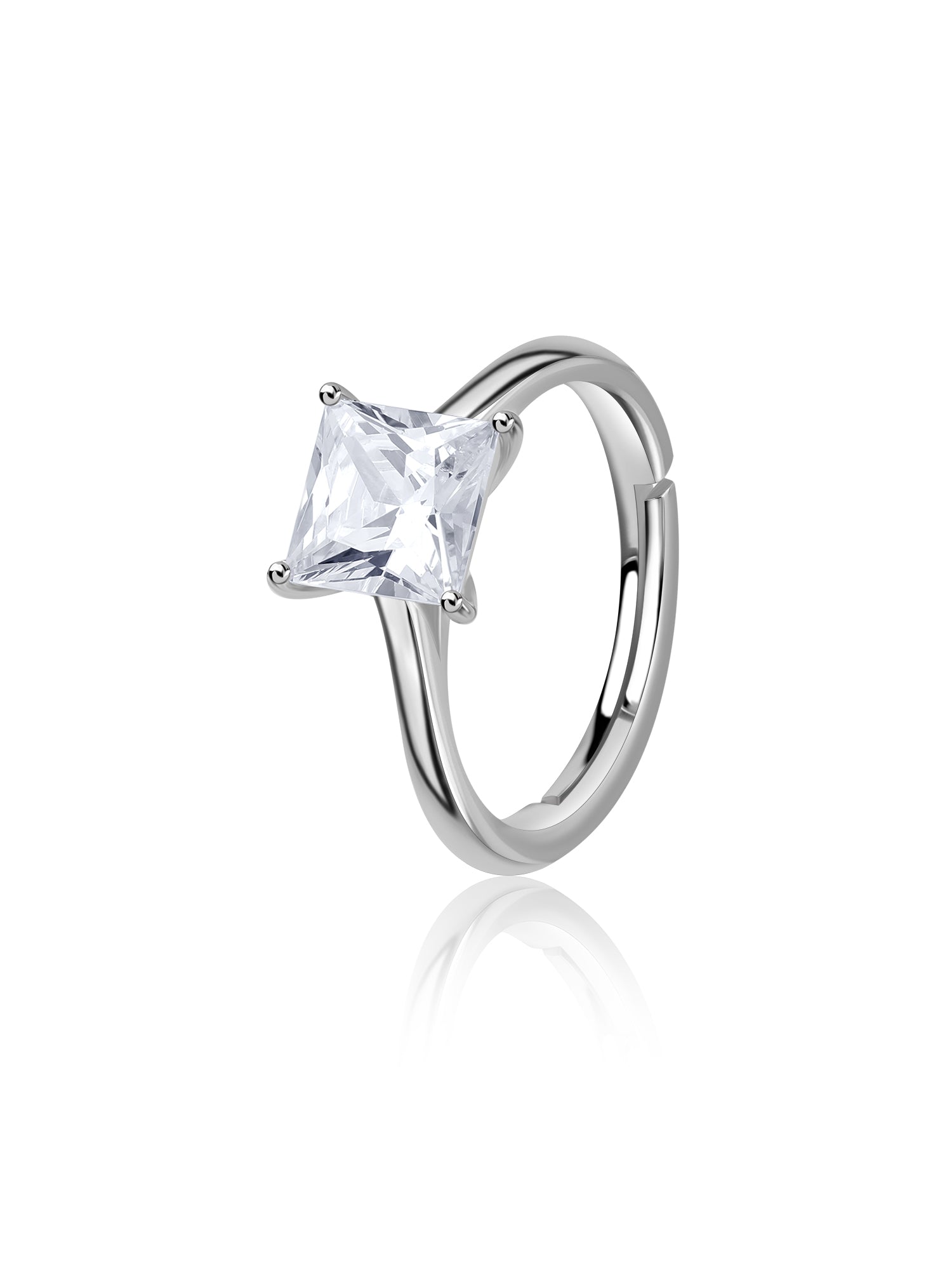 A modern classic crafted for everyday elegance, this silver ring features a brilliant princess-cut cubic zirconia set in a sleek, minimal band. Its adjustable design ensures a perfect fit, making it as comfortable as it is timeless. A chic statement piece that shines effortlessly with any look.