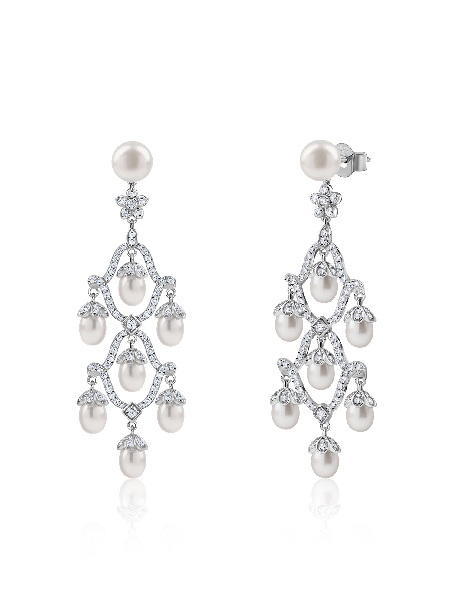 Gracefully designed in polished silver, these cascading drop earrings feature luminous freshwater pearls accented with subtle brilliance. The layered chandelier silhouette creates fluid movement and refined elegance, making it ideal for weddings, festive occasions, or elevated evening wear. A timeless blend of classic pearls and modern craftsmanship.