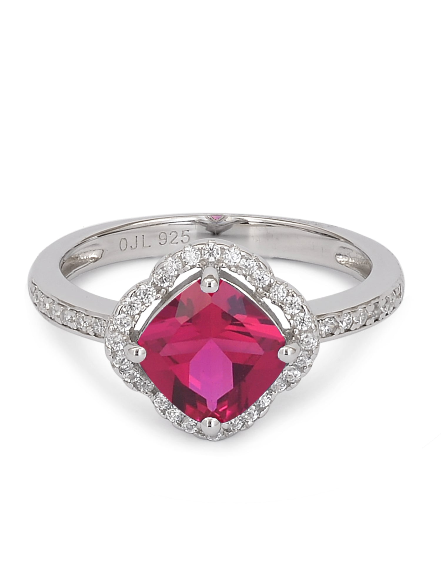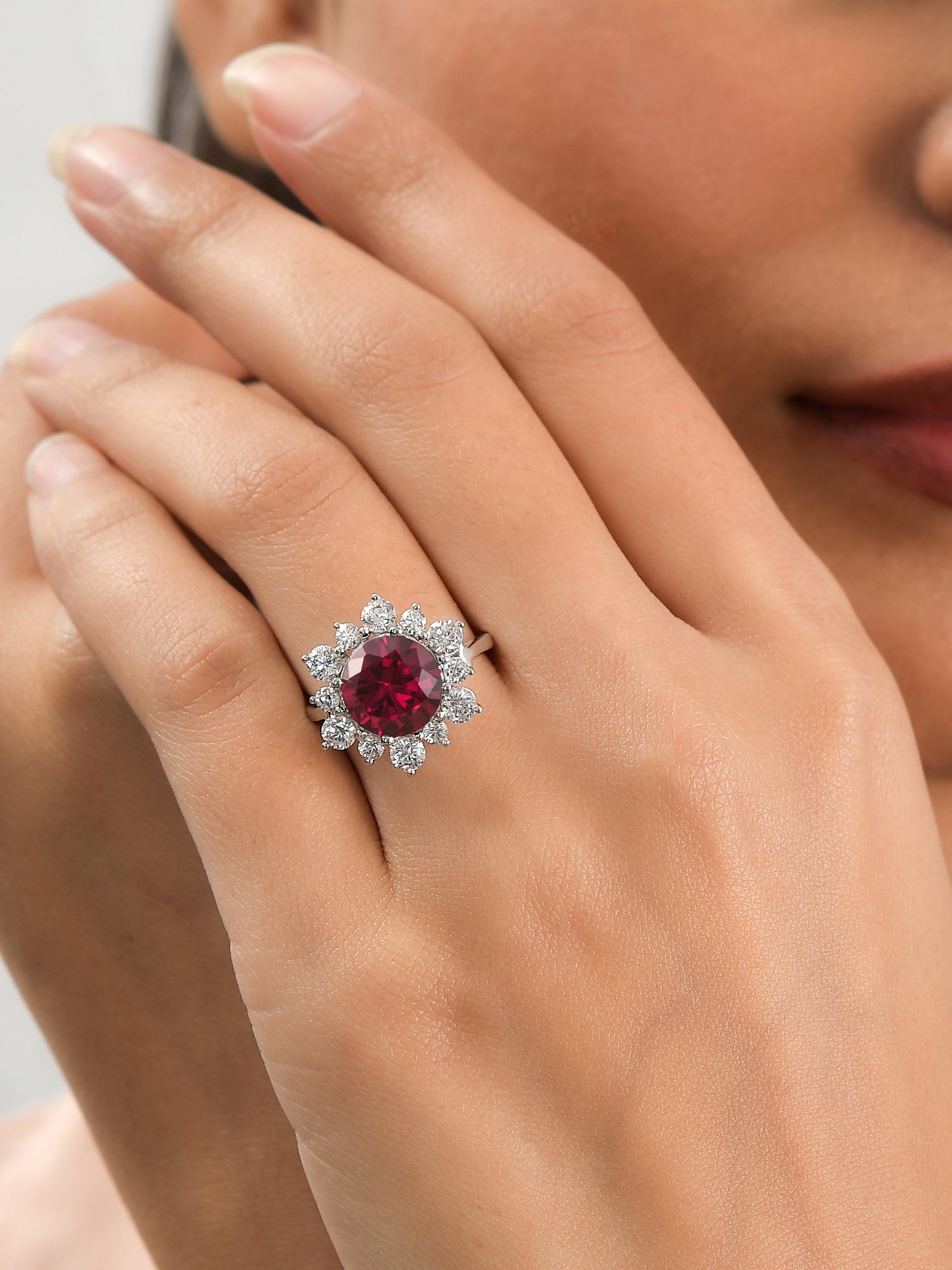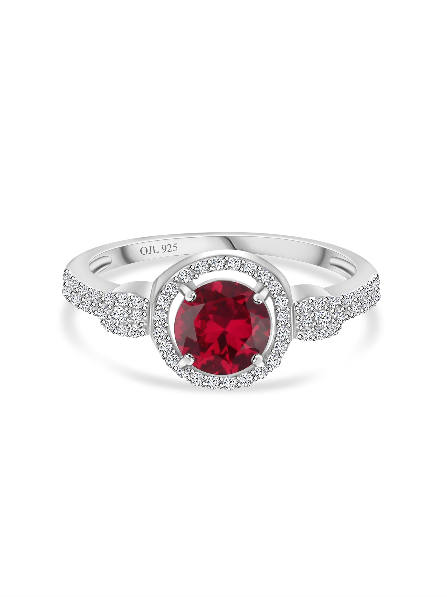 - Red Ruby Halo Silver Ring: The Red Ruby Halo Silver Ring is a beautiful piece designed for women. Its eye-catching red ruby, encircled by a sparkling silver halo, makes it a versatile jewelry suitable for any occasion. You feel gorgeous and fashionable when you wear this exquisite ring, which gives your appearance a touch of refinement and charm.