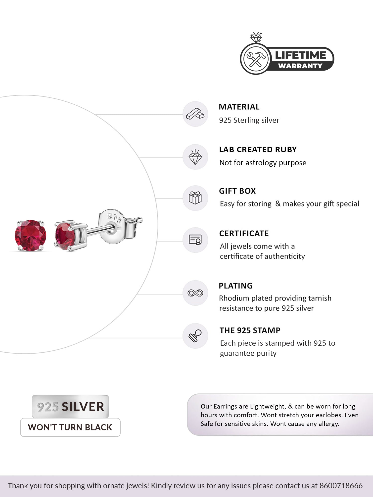 AAA grade Created Ruby solitaire studs. These are simple yet make a great everyday wear or a gift. Look for the matching pendant as well. It is well crafted in 925 silver that's hallmarked and is free of any cheap metals. It won't cause any allergies. Arrives in our signature gift box.