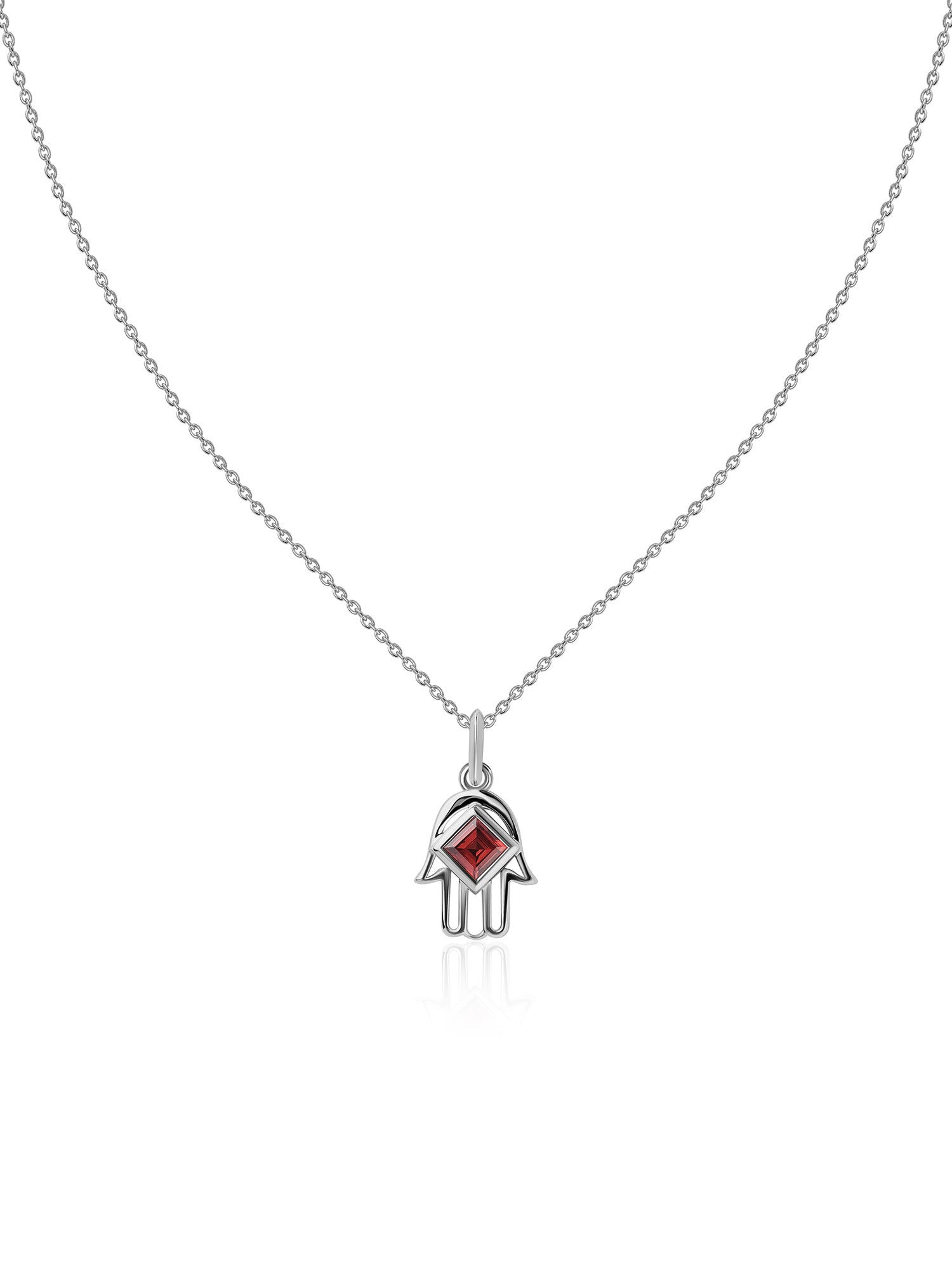 Crafted in sterling silver, this pendant showcases the protective Hamsa hand, accented with a Natural Red Garnet. Thought to attract calm and positive energy, this talisman is both a beautiful amulet and a style-forward statement.