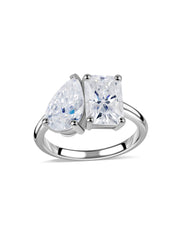 Turn heads with this magnificent 5-carat lab-grown diamond ring featuring a regal pear cut paired with a radiant cut centerpiece. Set in lustrous yellow gold with a secure prong setting, this bold engagement ring is designed to make a statement of luxury and love.