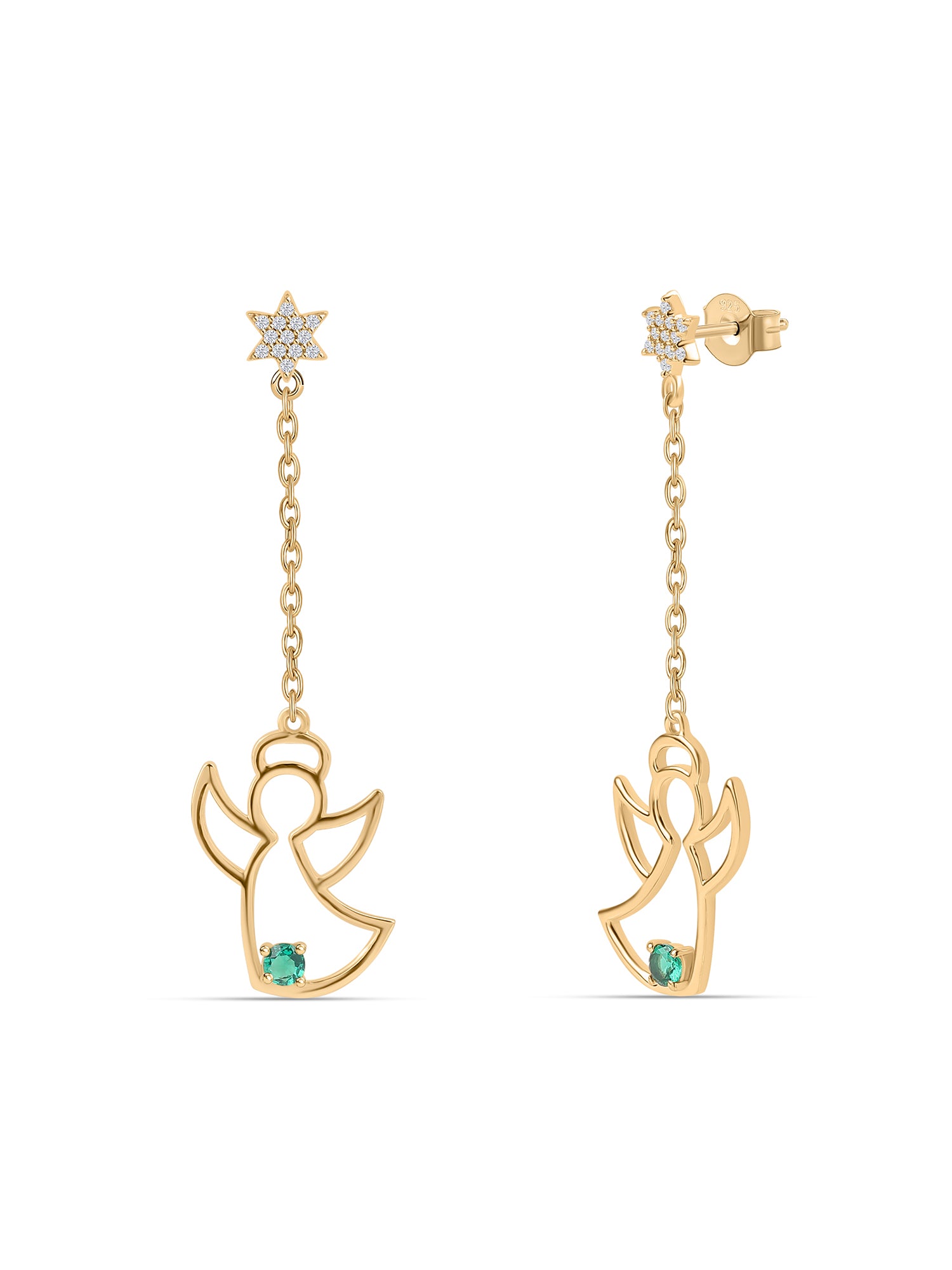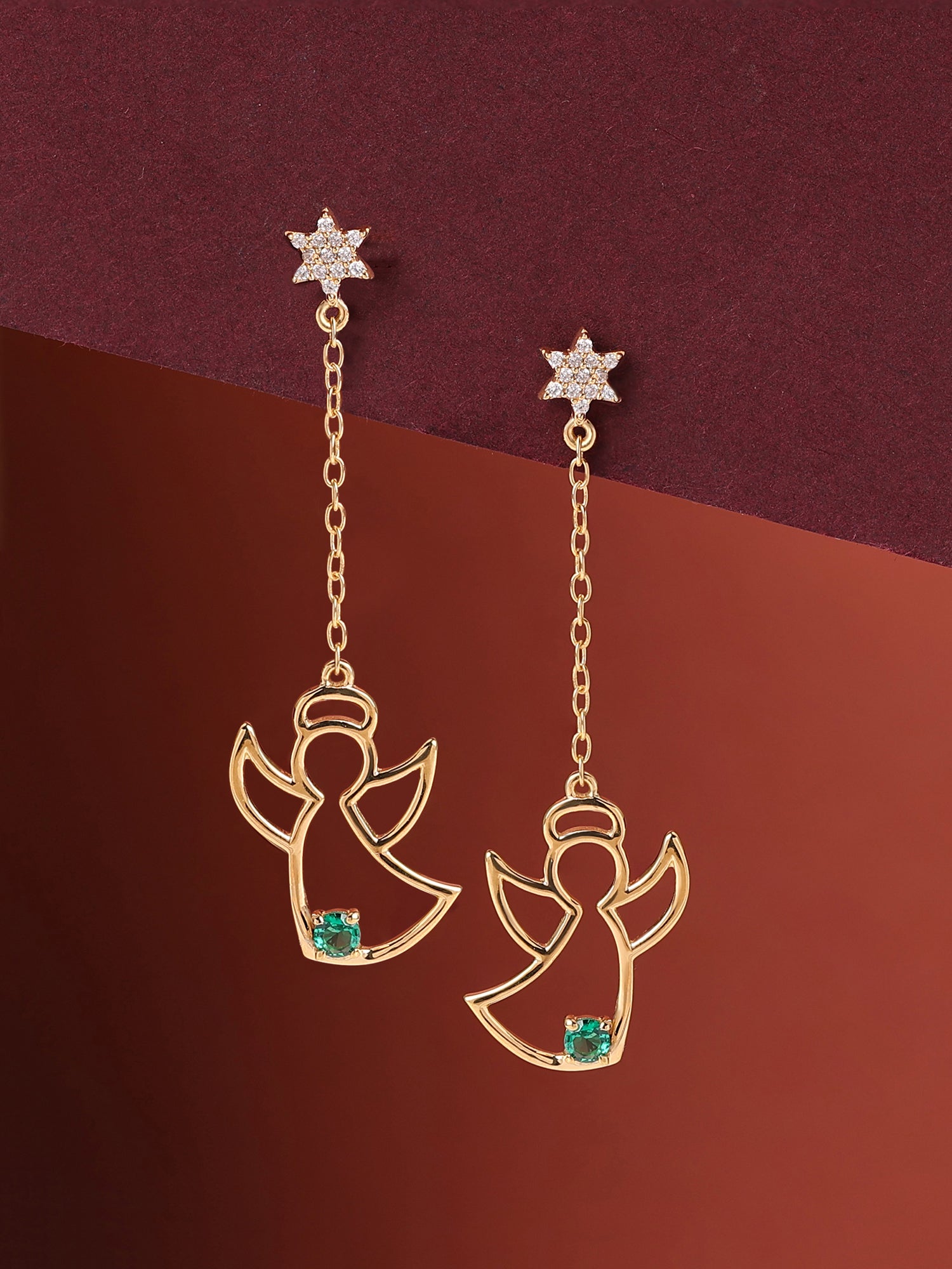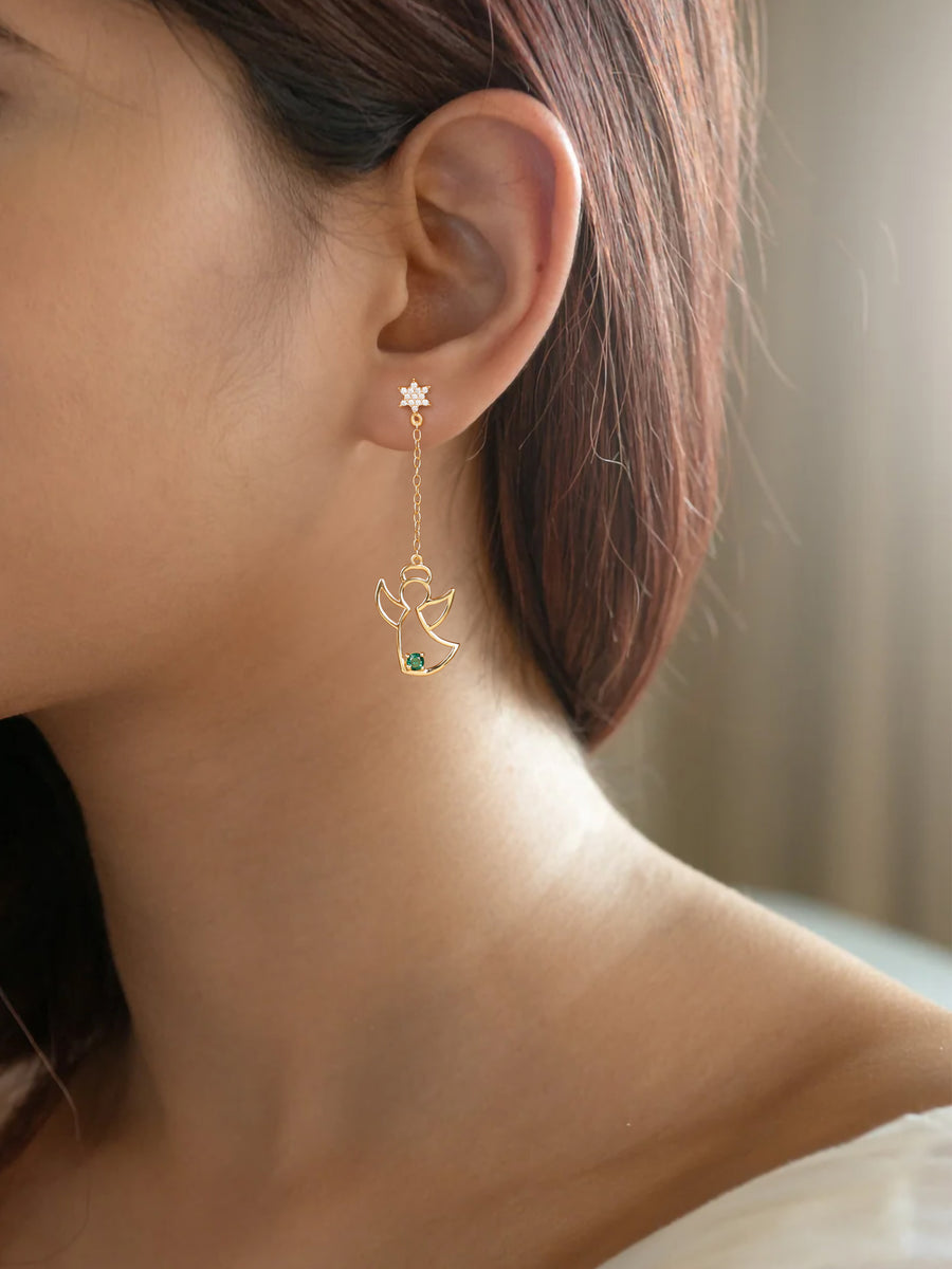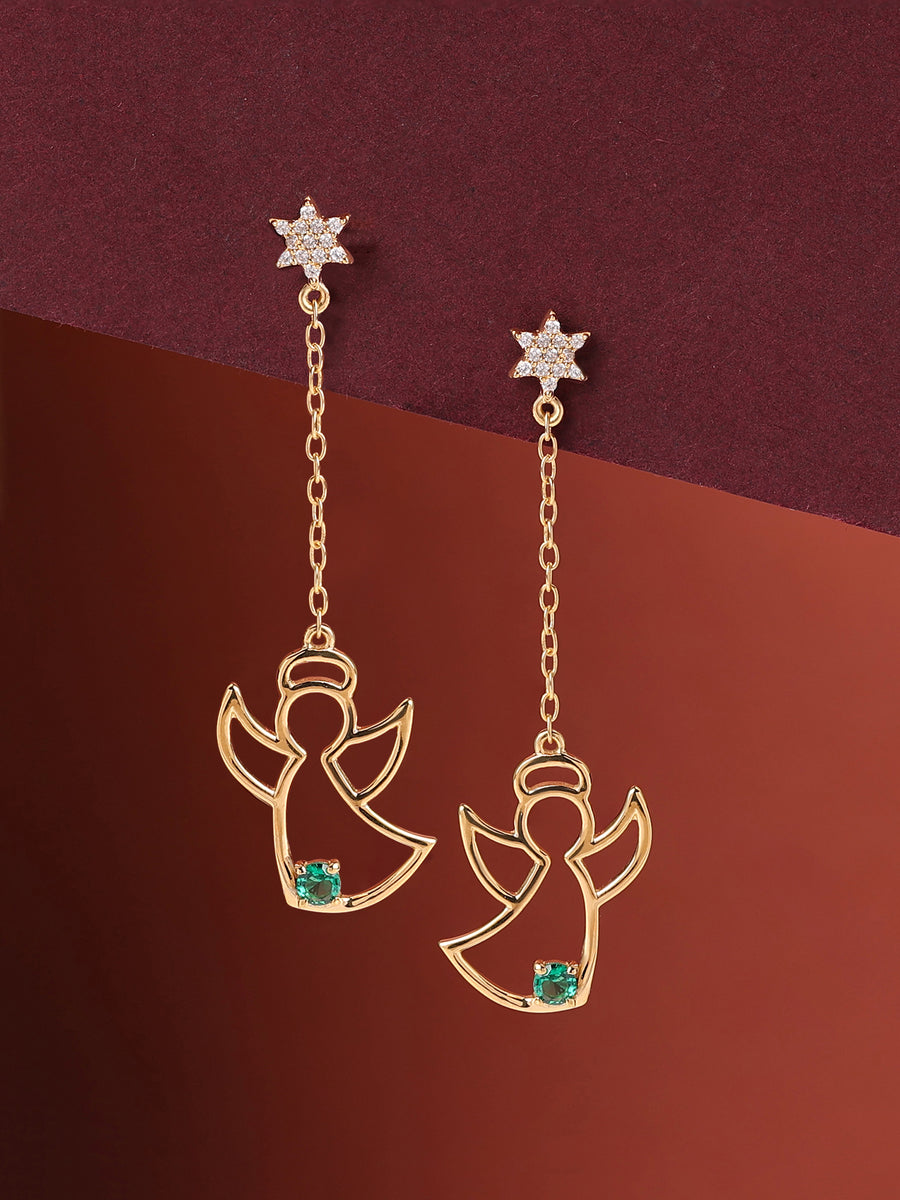 A unique pair of angel earrings that are studded with emeralds and are suspended from a silver chain. A designer earring for women that is a conversation starter
