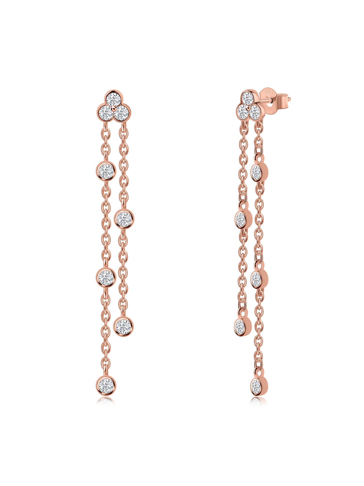Add a touch of elegance with these 925 sterling silver dangler earrings, gracefully plated in 18K rose gold. Featuring sparkling round white CZ stones in a bezel setting, these earrings offer a sleek and modern look with timeless charm.