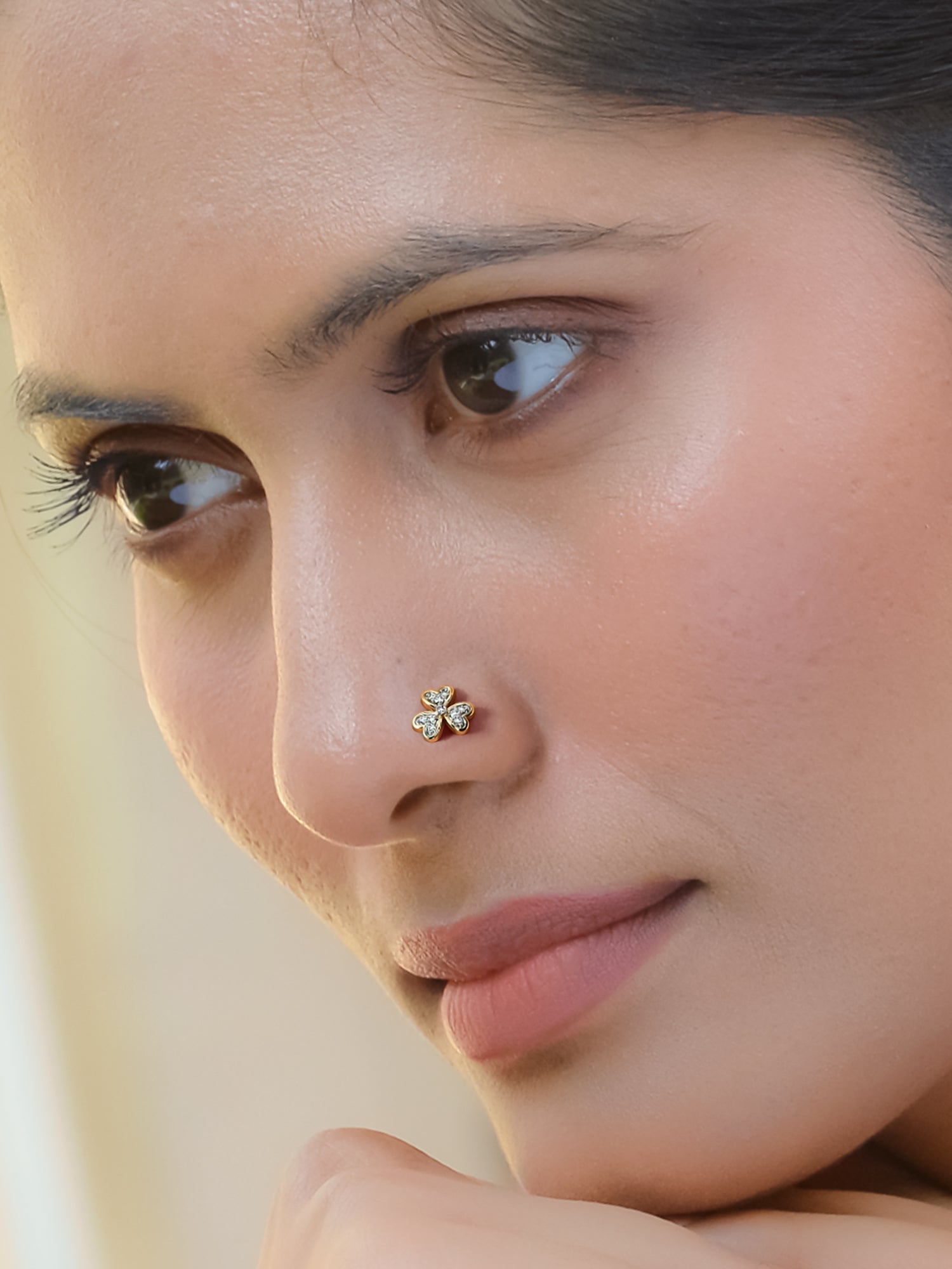 A clover-shaped lab diamond nose pin in gold, a fresh take on the traditional designs, and it has the right amount of sparkle.