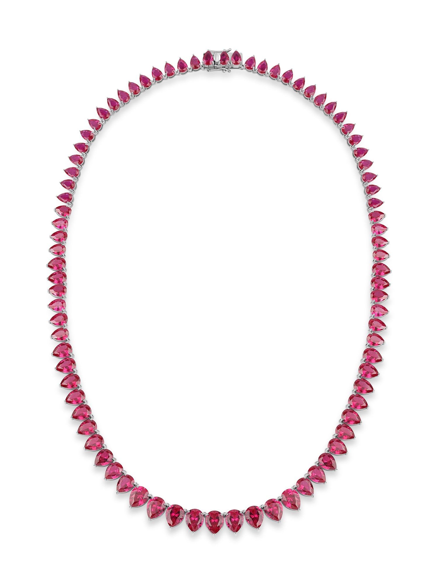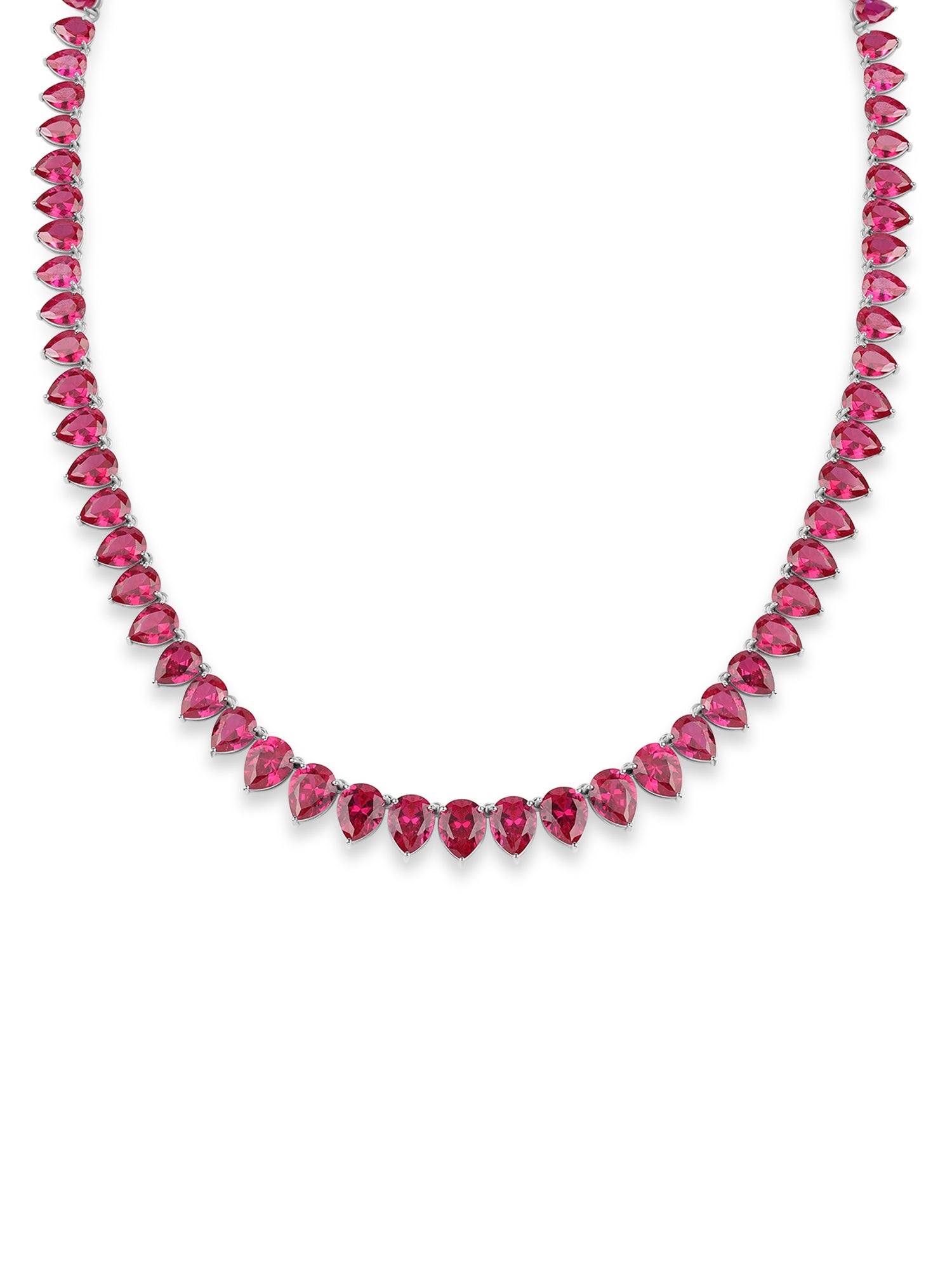 A timeless expression of elegance, this silver necklace is adorned with rich pear-shaped ruby stones arranged in a graceful flow around the neckline. The deep red hues create a bold yet refined statement, perfect for weddings, festive occasions, and evening celebrations. Designed to radiate luxury and confidence, this piece is a true classic for women who love enduring beauty.