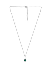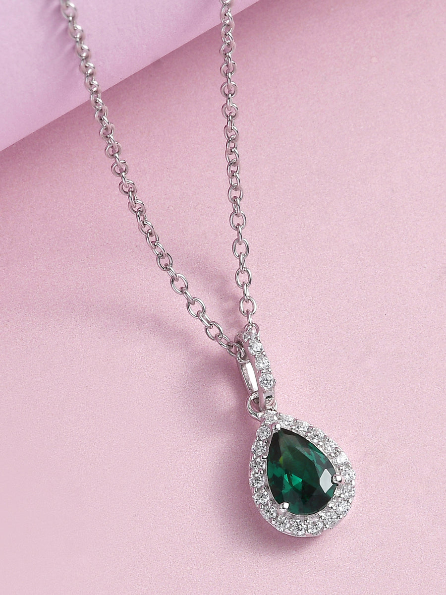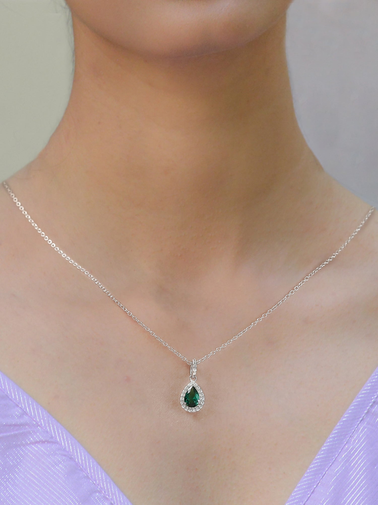This pendant features an emerald stone that is pear cut and has a rich and vibrant green color. The center is surrounded by smaller clear cubic zirconia stones that add more sparkle