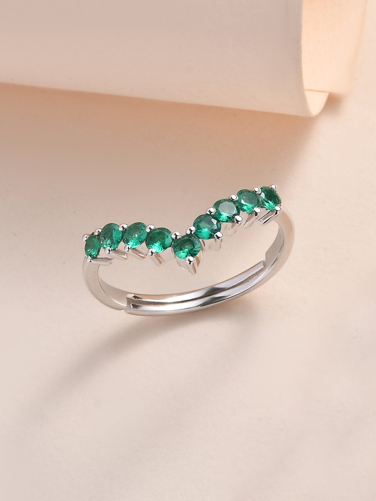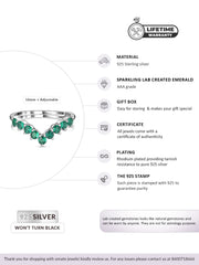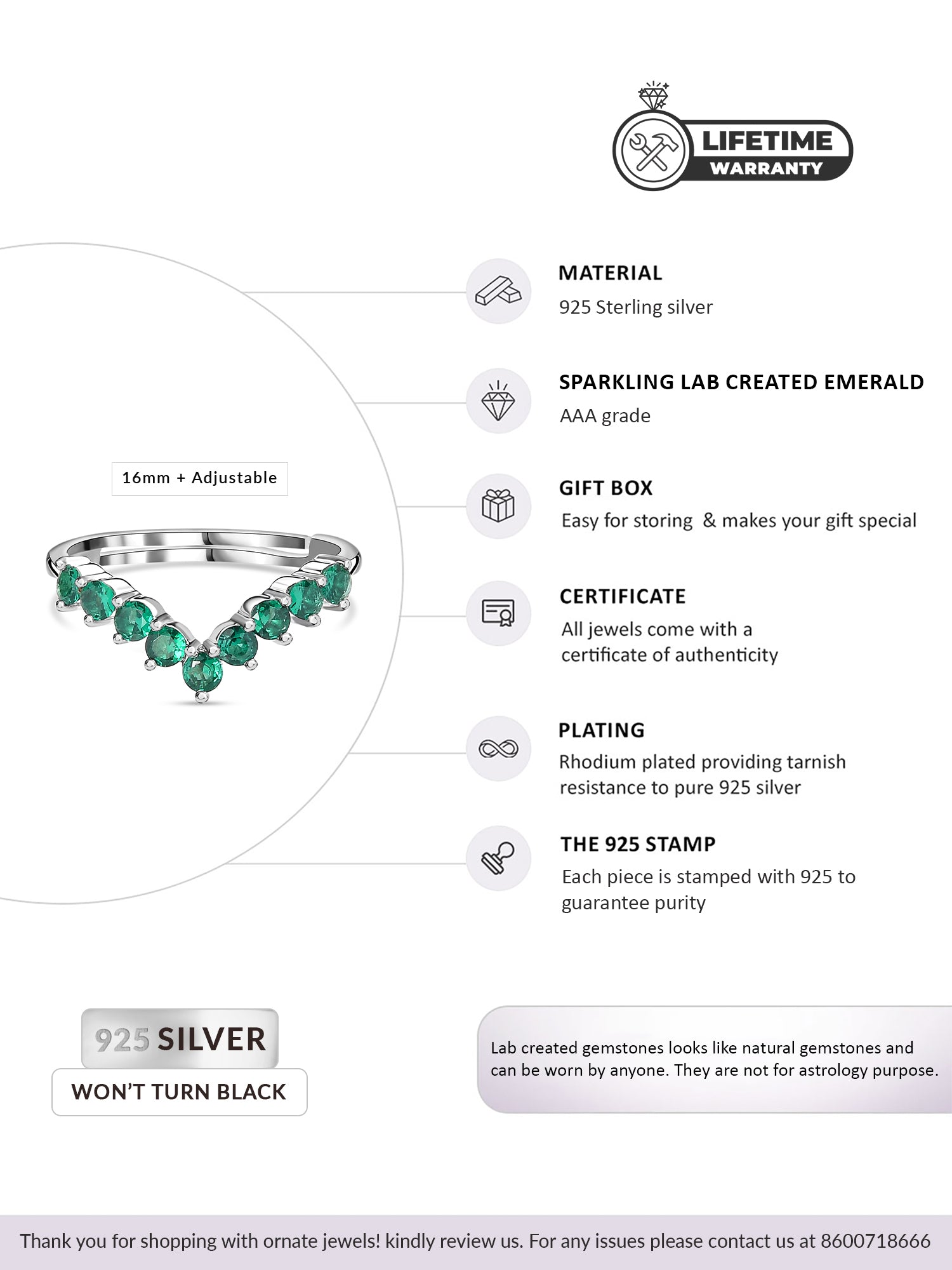 This adjustable Chevron Ring for women features a V-shaped wishbone design that is studded with sparkling synthetic emerald. The ring is made of pure 925 silver, which is hypoallergenic and durable.