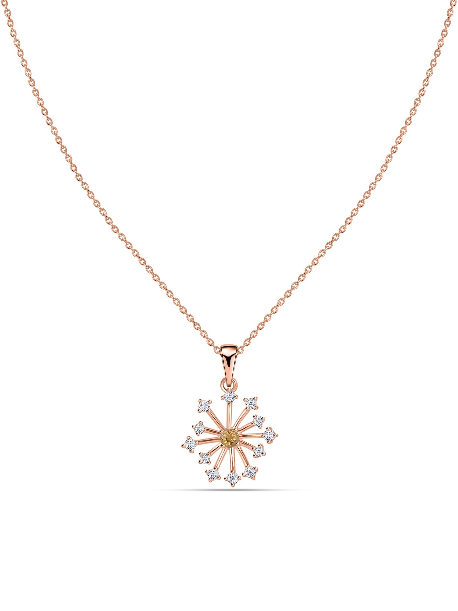This graceful snowflake pendant captures winter elegance with a sparkling Natural Citrine at its center, surrounded by brilliant lab-grown diamonds. Crafted in lustrous gold, it radiates symmetry and charm — perfect for gifting or adding a seasonal sparkle to your jewellery box. A timeless, nature-inspired design with a modern twist.