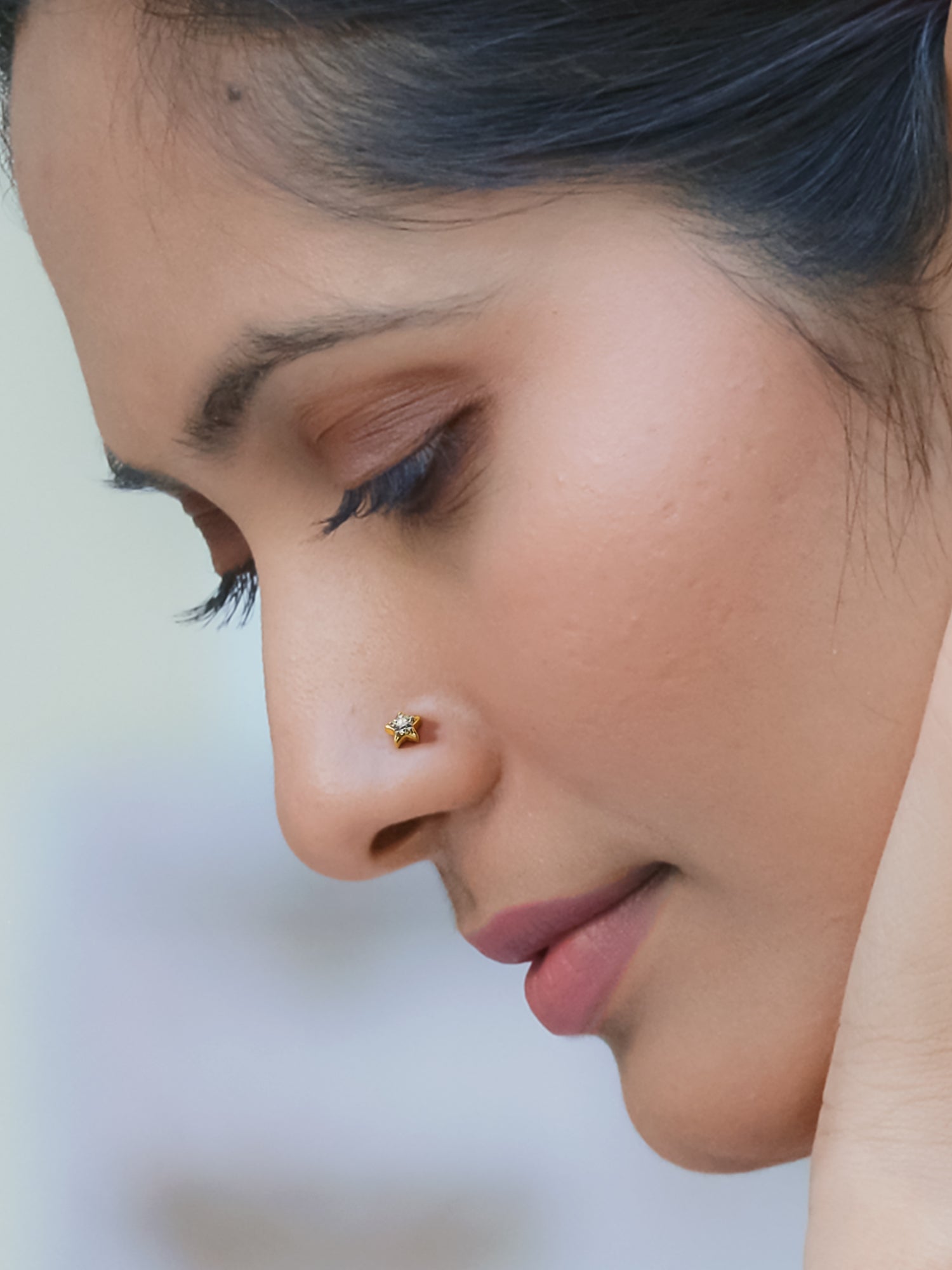 A star-shaped diamond nose pin for women that's made with pure gold and is sure to make you sparkle with joy